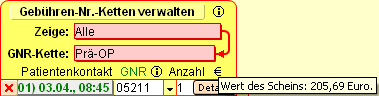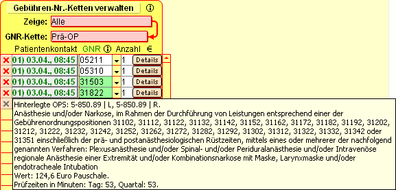 Die "Mouse-Over"-Funktion bringt Ihnen auch detaillierte Angaben über abgerechnete Ziffern einschließlich des Wertes und der Prüfzeiten: