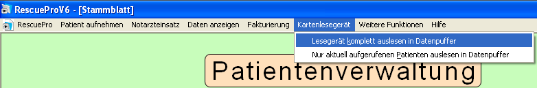Eine Funktion, die Sie als Anästhesist/In sicher bald sehr zu schätzen wissen werden, ist die Möglichkeit, alle gespeicherten Datensätze aus einem mobilen Kartenlesegerät "in einem Rutsch" auszulesen (nach unserem Informationsstand gibt es diese Funktion in keiner anderen Software). Meist haben Sie Ihren Computer ja nicht dabei, wenn Sie einen Patienten treffen, sondern werden dessen Versichertenkarte nur im Lesegerät speichern und dann ist es eine große Hilfe, wenn sie die Datensätze nicht einzeln aus dem Gerät "pulen" müssen, sondern mit einem einzigen Klick alle gespeicherten Kärtchen in RescuePro übernehmen können: